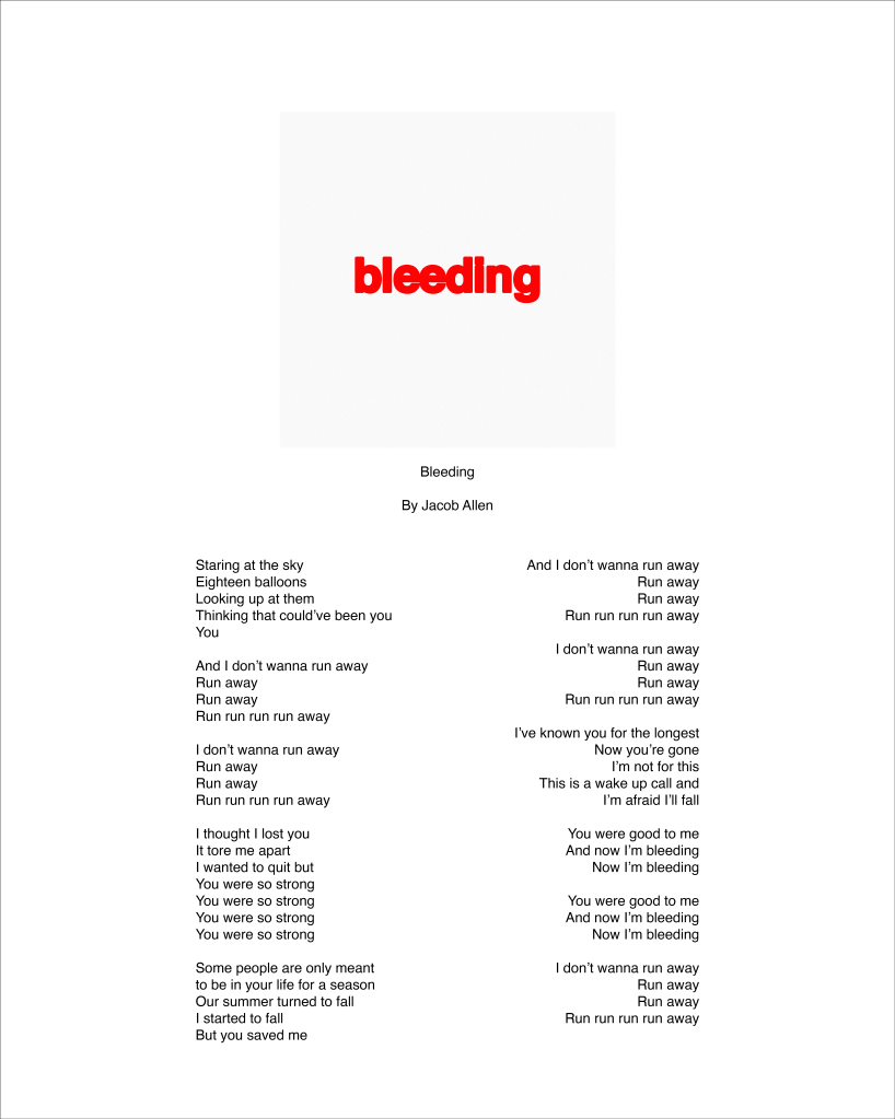 Lyrics for ‘Bleeding’ by Jacob Allen. Written & designed by Jacob Allen.