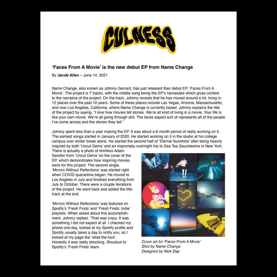 Interview with Name Change for Culness by Jacob Allen. Including photos by Name Change and design by Nick Dap. Written & designed by Jacob Allen.