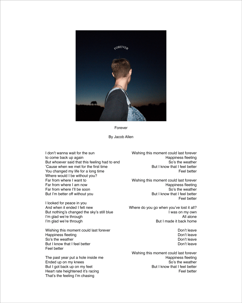 ‘Forever’ Graphic Design graphic design, music CD cover for ‘Forever’ by Jacob Allen. Shot by Jaden Taylor. Designed by Jacob Allen. CD for ‘Forever’ by Jacob Allen. Shot by Jaden Taylor. Designed by Jacob Allen. Promotional artwork for ‘Forever’ by Jacob Allen. Shot by Jaden Taylor. Designed by Jacob Allen. Lyrics for ‘Forever’ by Jacob Allen. Written & designed by Jacob Allen.