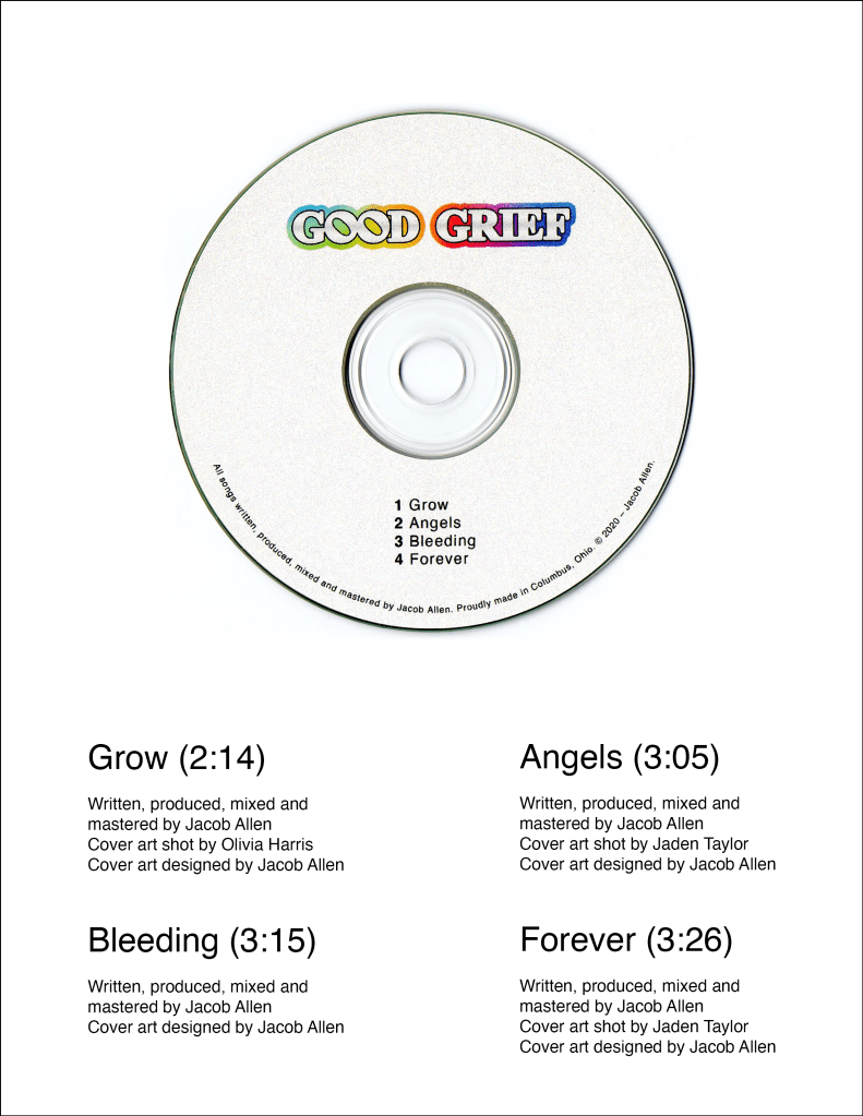‘GOOD GRIEF’ Graphic Design graphic design, music CD for ‘GOOD GRIEF’ by Jacob Allen. Shot by Jacob Allen. Designed by Jacob Allen. Credits for ‘GOOD GRIEF’ by Jacob Allen. Designed by Jacob Allen.