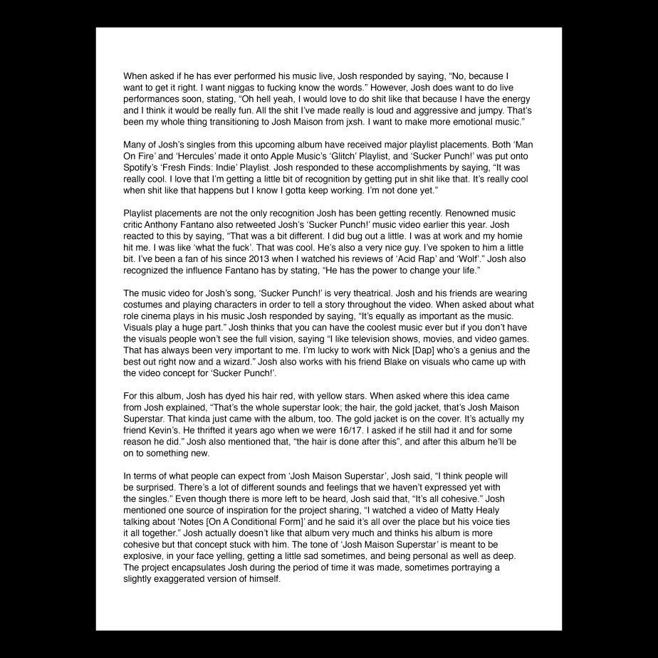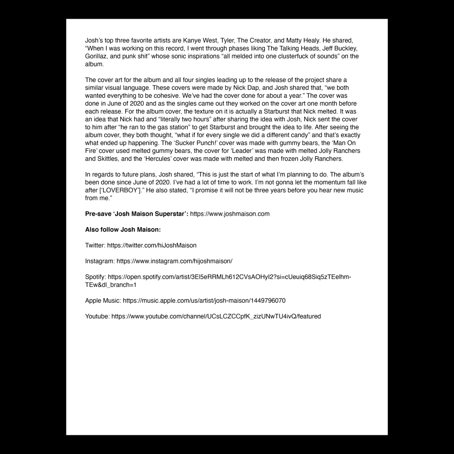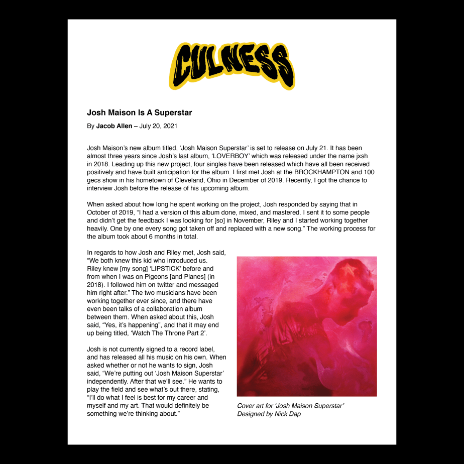 ‘Josh Maison Is A Superstar’ – Culness Interview interviews Interview with Josh Maison for Culness by Jacob Allen. Including design by Nick Dap. Written & designed by Jacob Allen.