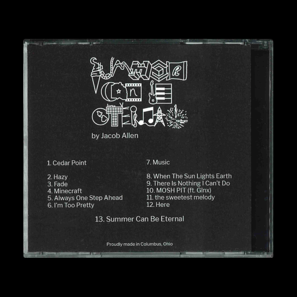 CD front cover for ‘Summer Can Be Eternal’ by Jacob Allen. Designed by Jacob Allen.CD back cover for ‘Summer Can Be Eternal’ by Jacob Allen. Designed by Jacob Allen. ‘Summer Can Be Eternal’ logo includes concept illustration by Mya Masica.CD sticker for ‘Summer Can Be Eternal’ by Jacob Allen. Designed by Jacob Allen. ‘Summer Can Be Eternal’ logo includes concept illustration by Mya Masica.Logo for ‘Summer Can Be Eternal’ by Jacob Allen. Designed by Jacob Allen. Including concept illustration by Mya Masica.Poster for ‘Summer Can Be Eternal’ by Jacob Allen. Shot, illustrated, and designed by Jacob Allen. ‘Summer Can Be Eternal’ logo includes concept illustration by Mya Masica.